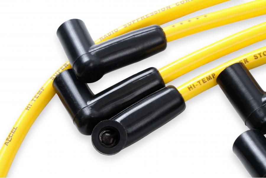 CUSTOM FIT SUPER STOCK SPARK PLUG WIRE SET; 8MM; COPPER WIRE CORE; WIRES ROUTED OVER VALVE COVER; YELLOW W/HEI STOCK STYLE BOOTS; |