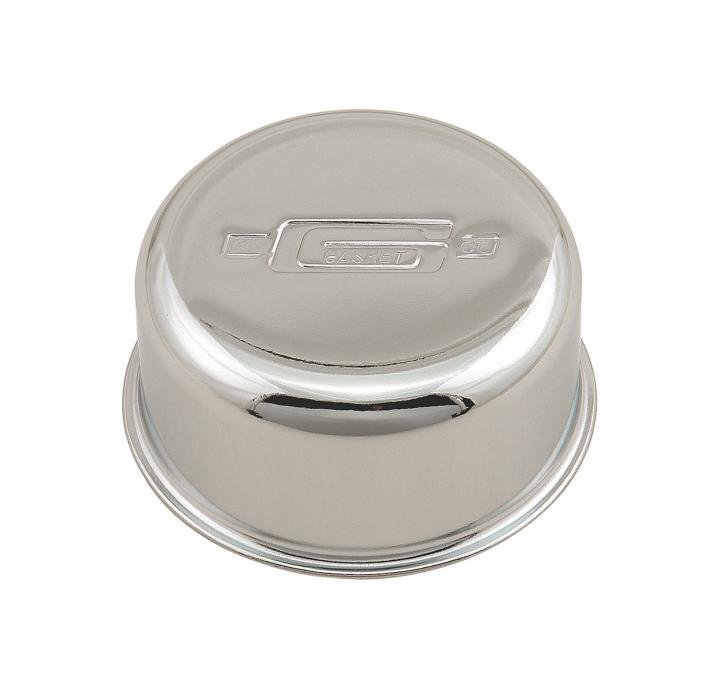 This logo embossed breather also acts as oil filler cap. The chrome twist in round breather fits valve covers with 1-1/4 inch hole. Breather has an internal baffle, ideal for high performance use. 2-3/4 inch diameter x 2-1/8 inch tall with logo.