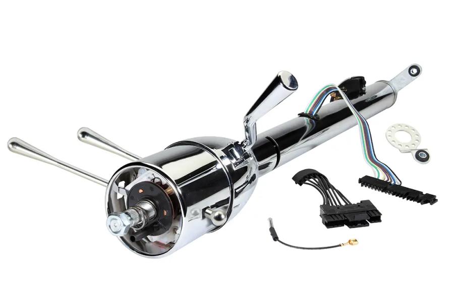The CPP Premium Deluxe Tilt Column is a chrome floor shift tilt steering column. Designed for 55-56 Tri-Five models. Offers adjustable tilt for comfort. Enhances driving experience with sleek design. Easy installation. Durable construction.