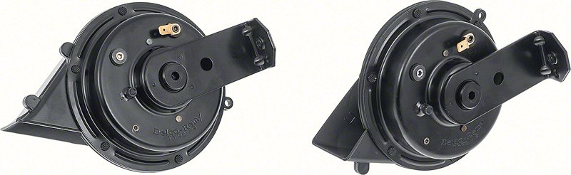 Quality reproduction of the original horn assembly designed for use with 1961 Chevrolet Impala, Bel Air, and Biscayne models. These exact reproductions feature correct semi-gloss black "swirl" shaped housings, with "Delco-Remy" words in the original font. Features the correct mounting brackets specifically designed for use with 1961 models installed on the horns. Each pair includes a high and low note horn. Officially licensed by General Motors.