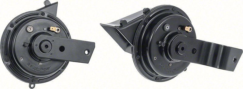 Quality reproduction of the original horn assembly designed for use with 1963 Chevrolet Impala, Bel Air, and Biscayne models. These exact reproductions feature correct semi-gloss black "swirl" shaped housings, with "Delco-Remy" words in the original font. Features the correct mounting brackets specifically designed for use with 1963 models installed on the horns. Each pair includes a high and low note horn. Officially licensed by General Motors.
