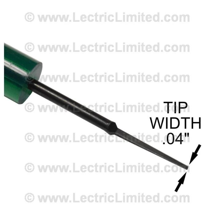 blade width.04". If you need to remove a metal terminal from its plastic connector, this genuine Aptive/Delphi tool allows you to depress & release the locking tang on most terminals used by GM from 1950-80s. Not for use with Weather-Pak terminals. Made in USA.