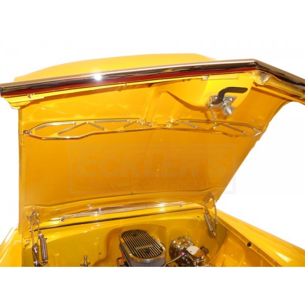 CNC machined from a solid chunk of 6061T6 aluminum, our billet hood brace adds a stunning touch to the engine compartment in your 1955 Chevrolet Bel Air, 210, 150, Nomad or Wagon. They do, however, require drilling out rivets to remove the stock parts. New stainless steel fasteners and mounting hardware is included. Our billet aluminum hood brace will not clear the radiator hose on cars with the stock six cylinder radiator mounting position.