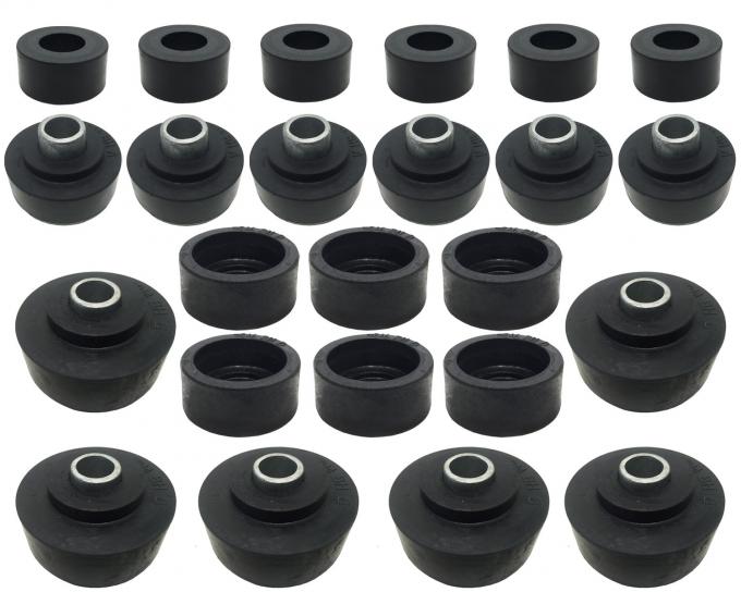 This body mounting kit contains all mounting bushings. It is correct S.B.R. compression molded with steel sleeve inserts. Bushing are made of high grade non recycled rubber.