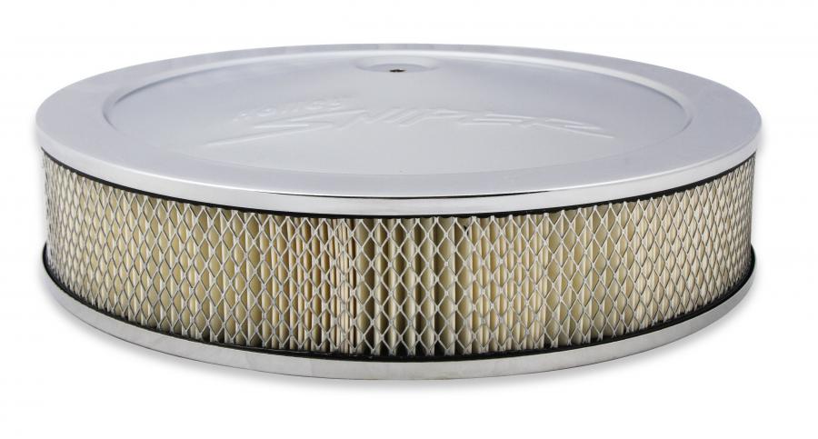 Complete your Sniper upgrade with our new 14" Sniper air cleaner assemblies. Each air cleaner assembly includes a stamped steel lid with an embossed Holley Sniper logo, a 1" drop base specifically designed for Sniper EFI applications, your choice of a 3" or 4" paper filter element, and all necessary mounting hardware. The included drop base fits all carbs and throttle bodies with a 5-1/8" neck - more specifically Sniper EFI 4150 throttle bodies with clearances for front mounted fuel fittings*, and Sniper EFI 2300 throttle bodies. Available in both black and chrome finishes to best match your SniperEFI unit.