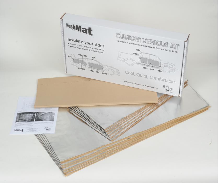 Comfort and style are earmarks of your vehicle. HushMats sound deadening and thermal insulation enhances the experience with the easiest to install sound deadening material. Your vehicle is fun to drive, but the engine gets hot. Your engine, headers, manifold and exhaust generate tremendous heat that transfers to the metal firewall and floor and this heats up your vehicle interior. This also forces your AC system to work harder to reduce and maintain comfortable temperatures inside your vehicle. HushMat proprietary USA manufactured chemistry makes the automotive heat shield dissipate this heat, insulating your interior, and improving the load on your HVAC system which makes your vehicle significantly cooler in the summer and warmer in the winter. HushMat is proven in an independent study to lower this temperature by over 40 percent. When you drive on the highway at approximately 65 miles per hour the interior of your vehicle is approaching 80 to 90 decibels of noise. That is like placing a vacuum cleaner or garbage disposal running on your passenger seat. HushMat uses a specially designed sound deadening mat to REDUCE the noise level in your vehicle by up to 15 decibels. When you drive on the highway and then exit. At the end of the exit ramp the first thing you do is turn down your radio or music because it was too loud. The same is true when speaking on a cell phone or through blue tooth. Eliminate the road noise with HushMat and enjoy your conversation without yelling over the noise. HushMat sound deadening mat leads the automotive sound deadening industry in ease of installation. It is also the number 1 Rated in performance. Hushmat is packaged specifically for your vehicle to provide 100 percent insulation coverage, there are no holes in the material and no puzzle pieces to put together. Treat your firewall, doors, floor, tunnel, rear wheel wells, trunk floor and roof with this complete kit.