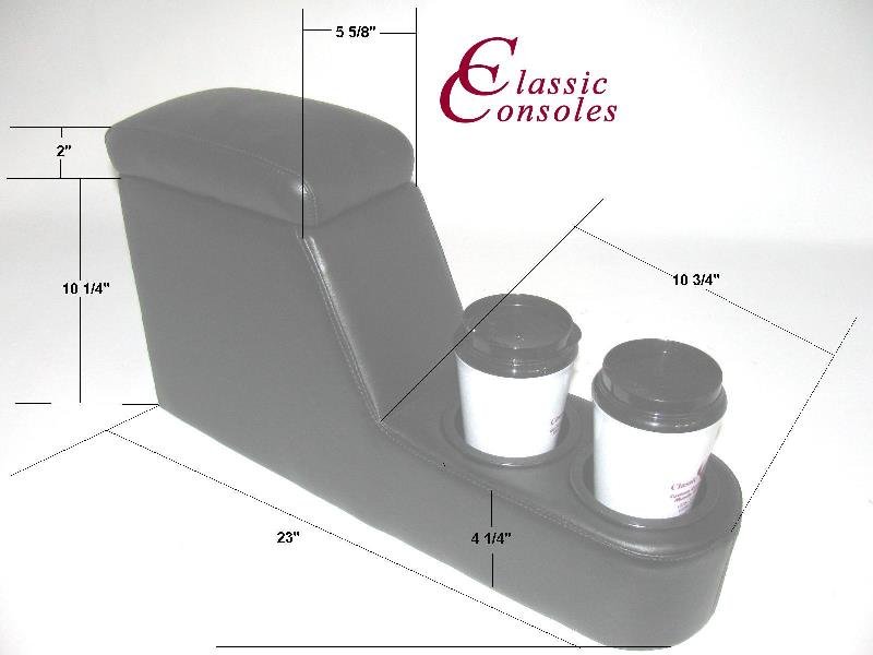The convenient features built into this console will bring a whole new style and feeling when cruising in your classic Corvair. Standard features include a padded armrest, designed for maximum support and comfort. Combined with an under-lid storage compartment and two drink holders. Because of the limited space between the Corvairs seats, this console is slimmer than our traditional HumpHuggers. As a result, the drink holders sit in line just in front of the armrest. You have the option to choose two large drink holders or upgrade to two Mega drink holders.