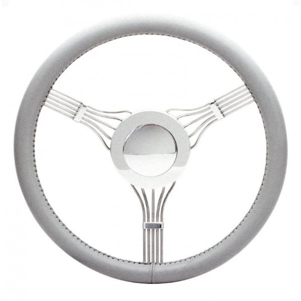 This Banjo style steering wheel has five strand "strings" curving out elegantly to meet the center of the wheel. The included horn button perfectly matches the polished aluminum finish of the wheel. The Banjo Steering Wheel is easily adapted to other brands of columns. lt;/div>