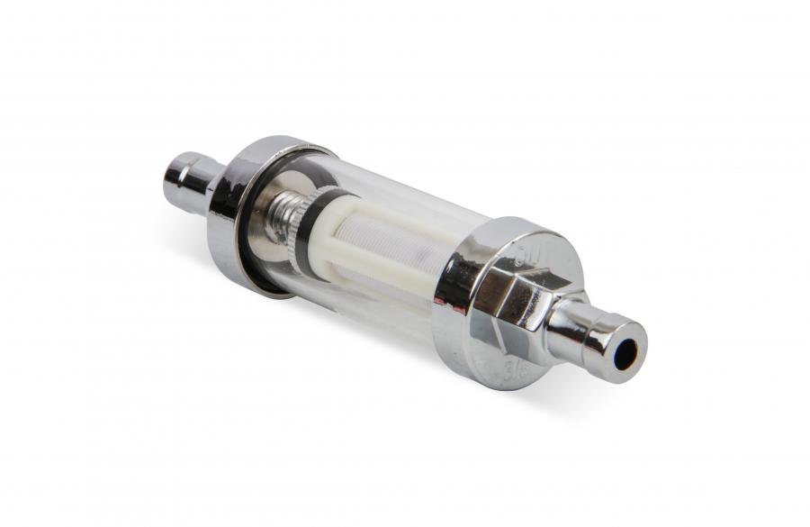 The in-line Clearview fuel filter has chrome ends and a glass body for clear and quick viewing of fuel flow and debris trapped in the 100 micron white mesh replaceable filter element. Supports up to 400 horsepower, fits 3/8 inch fuel hose only.