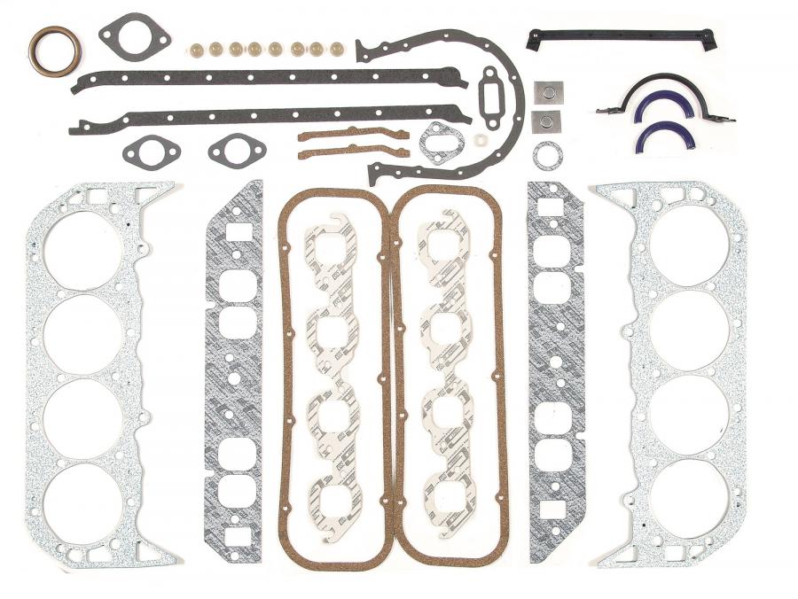 Includes cylinder head gaskets, intake gaskets, exhaust gaskets, oil pan gaskets, valve cover gaskets, timing cover gaskets, fuel pump gaskets, water pump gaskets, distributor gaskets, thermostat gaskets, and rear main seals. For OE replacement, high-performance street, drag racing, or oval track racing.