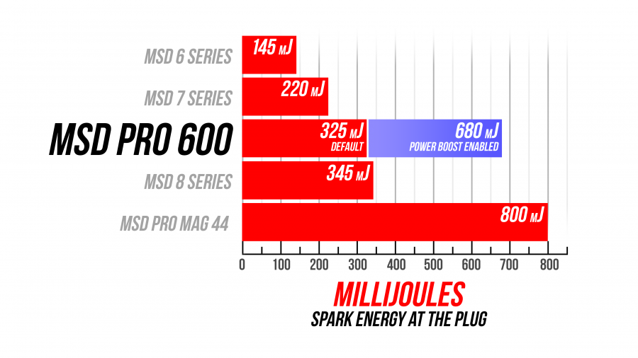 The Single Channel Pro 600 Ignition is engineered and built for the most demanding racing applications and is the HOTTEST single channel ignition box for use with the MSD Power Grid. This ignition is capable of running continuously at an energy level of up to 600 mJ inducing more than 250 microseconds of spark duration. With a Power Boost wire, the ignition output can be changed on the fly between programmable lower energy (325 mJ by default) to its maximum energy output of 600 mJ. The lower energy setting reduces the battery power requirements and lessens the stress on the secondary ignition components (distributor cap, rotor, spark plug wires and spark plugs). The ignition's Alternating-Current (AC) operation with an internal coil-coupler considerably increases spark-gap energy and duration over Direct-Current (DC) Ignitions. This increased efficiency translates to more energy at the spark gap combined with longer spark duration and cooler operating temperature of the ignition coil. To further improve efficiency, unused spark energy is recycled back to the ignition capacitor reducing the power drawn from the battery. The Single Channel Pro 600 Ignition provides up to 20% additional spark gap energy and a 40% increase in spark duration over other 600 mJ ignitions available in the market. Additionally, the ignition's high-efficiency design reduces power demand from the battery, which in turn reduces loads on the wires and connectors. As the Single Channel Pro 600 Ignition is designed for the most challenging applications, it is also capable of continuous full-power operation. The Single Channel Pro 600 Ignition is designed to work with the MSD Power-Grid and can provide firing-by-firing spark current data acquisition. A Diagnostic LED detects the presence of faults - such as an Open Coil Primary, Shorted Coil Primary, Reversed Primary Connections, or Open Coil Secondary.