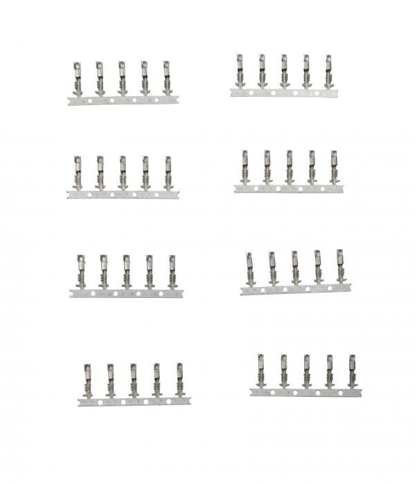 The supplied connectors and pins are "Pull to Seat " This means that you need to insert the wire through the connector from the back, crimp the pin and pull it back into the connector for assembly. Always use proper crimping tools to ensure a proper connection.