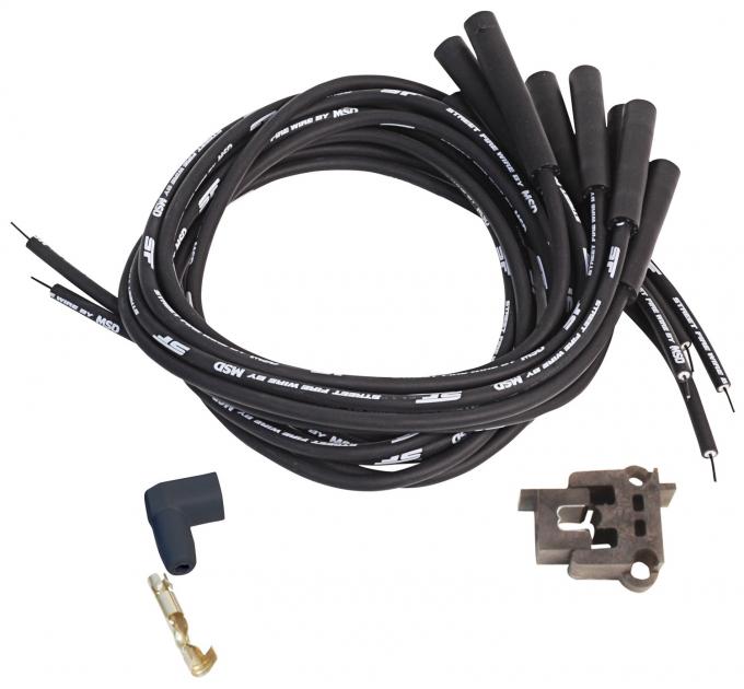 The street fire spark plug wires feature a low resistance conductor that's wrapped in a sleek and durable black sleeve. The terminals are covered in black boots that protect the conductor from engine heat to ensure spark delivery.