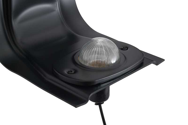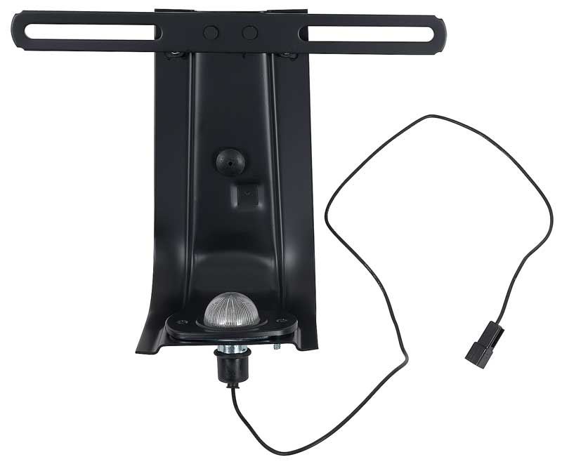 Reproduction of the rear license plate bracket and lamp assembly designed for use with 1954-59 Chevrolet and GMC pickup trucks. Each bracket is manufactured in stamped steel replicating the original factory bracket with lamp and wiring. Includes 6 volt bulb. Available in black only. NOTE: Will not fit 1958-59 Chevy and GMC Fleetside truck models.