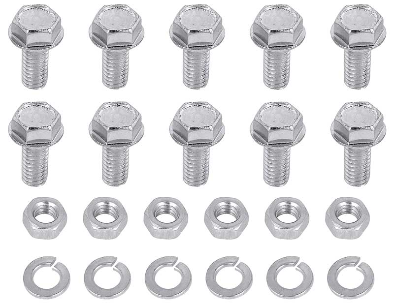 Reproduction of the hardware required to install the front bed panel on 1954-87 Chevrolet Pickup truck models with wood floor, and 1954-87 GMC stepside models. This front panel zinc plated hardware kit includes all the necessary nuts, bolts and washers to mount the front panel to the bed side panels on beds with wood floors.