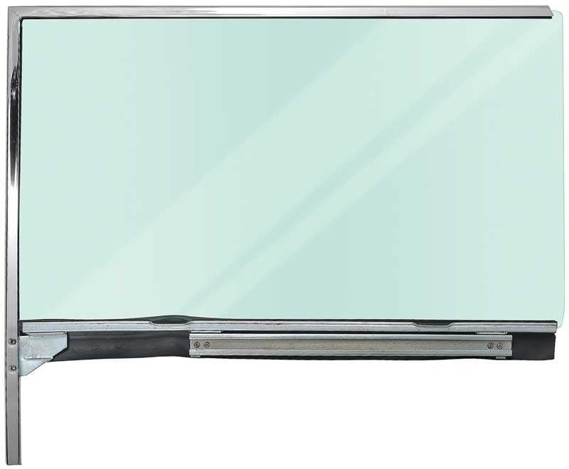 Reproduction door glass assembly for 1955-57 Chevrolet passenger two door hardtop and convertible models. Comes with frame and new glass completely assembled ready to install.