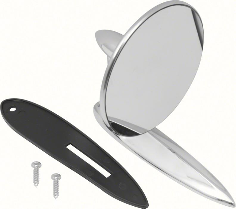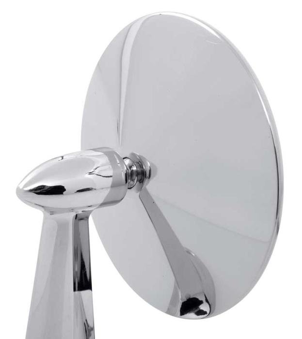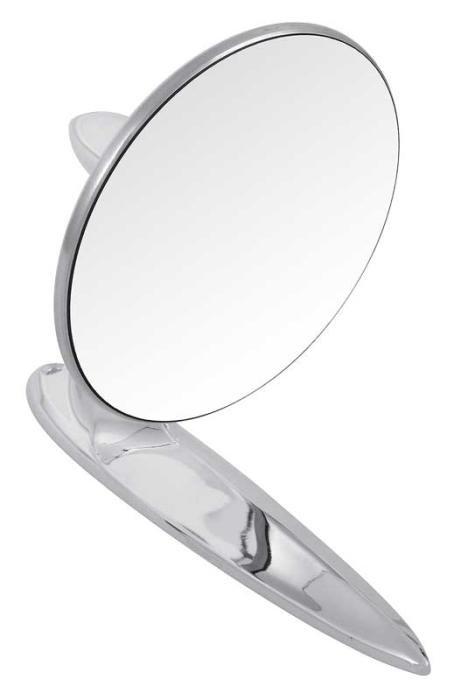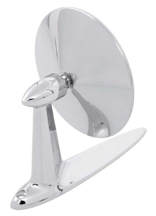 Reproduction of the original exterior outer door mirror designed for use with 1955-57 Chevrolet models. Each mirror assembly is manufactured from high-quality zinc die-cast material featuring factory-correct contours and a brilliant chrome-plated base for an authentic appearance. The mirror head is crafted from polished stainless steel for superior durability and corrosion resistance. Fits either the driver or passenger side and includes all necessary mounting hardware for easy installation. Mirror base measures 6-3/8" in length, and the mirror head measures 4-5/16" in diameter.