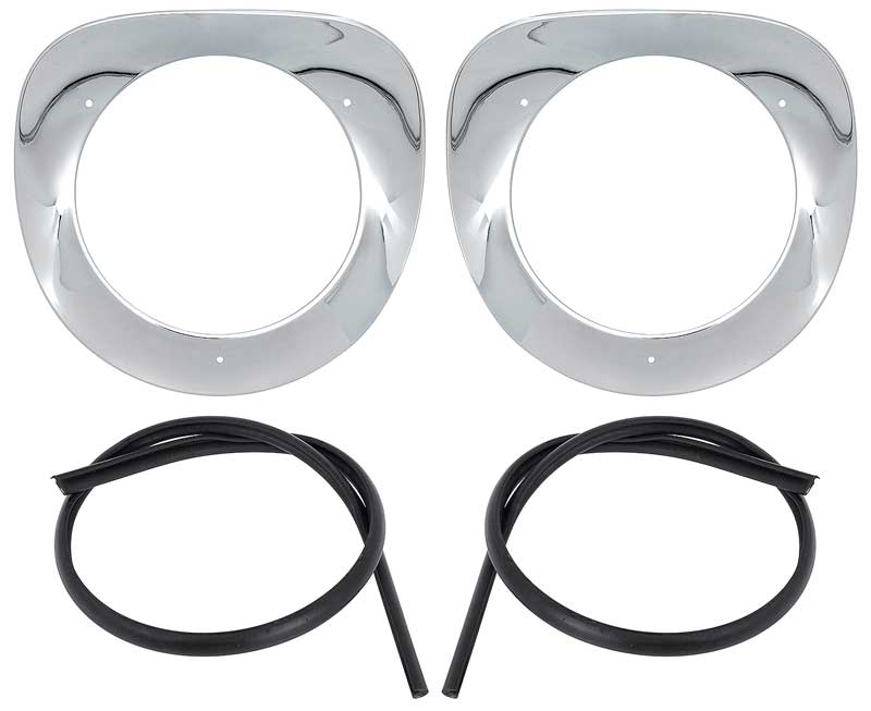 Quality reproduction headlight bezels for 1955-57 Chevrolet and GMC pickup truck models as listed. Each bezel is manufactured in die-cast and chrome plated to factory specifications. Includes seals and hardware for easy installation. Includes RH and LH headlight bezels.