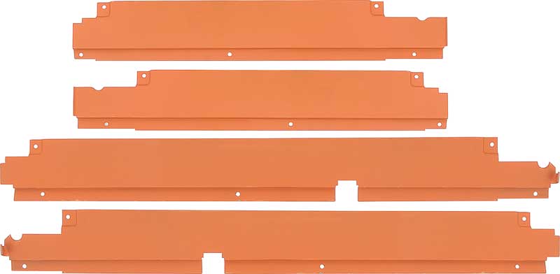 Reproduction of the original style floor wiring covers for use with various 1955-57 Chevrolet Bel Air, One-Fifty Series, and Two-Ten Series 4 door hardtop models. Each cover is manufactured to original factory specifications offering a correct fitment when installed. These covers are screwed to the floor underneath the carpet at the door sills. Features original configuration and pre-punched holes for easy mounting. 4 piece set for front and rear door.