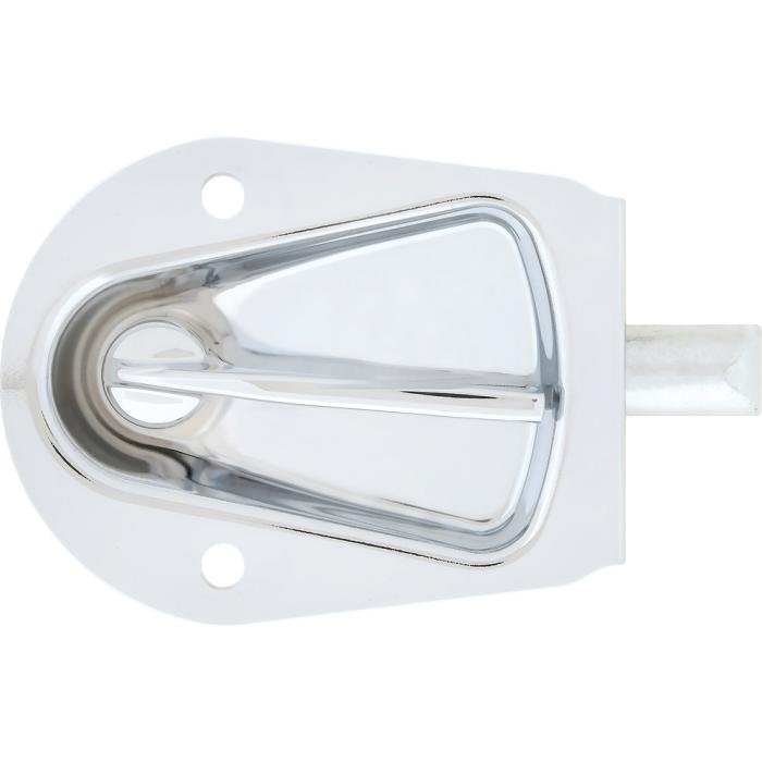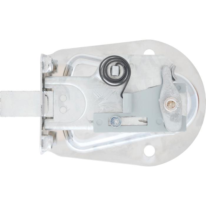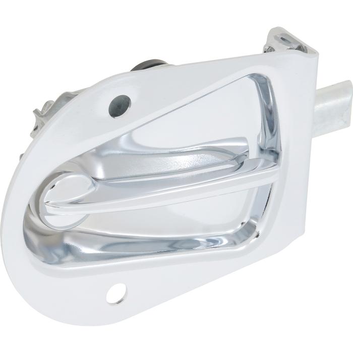 Reproduction tailgate latch assembly for the LH side on 1955-58 Chevrolet Cameo or GMC Suburban Carrier pickups. Housing is manufactured in stamped steel and plated in bright chrome for an original appearance. Handle is die-cast metal with bright chrome finish, as original.