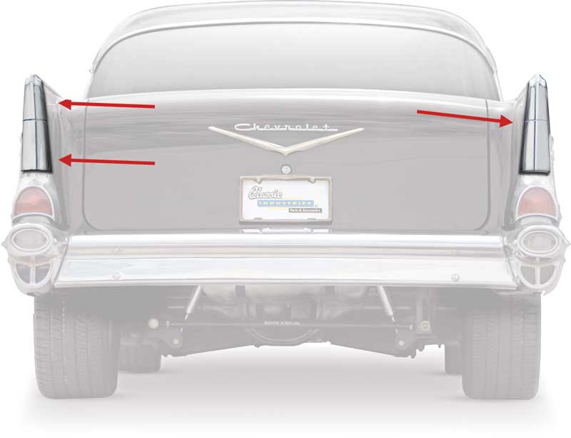 Reproduction of the original style quarter vertical fin moldings for use with 1957 Chevrolet Bel Air, 150, and 210 models. Feature correct stainless finish, along with correct contours and mount just like the originals. Sold in 4-piece sets.