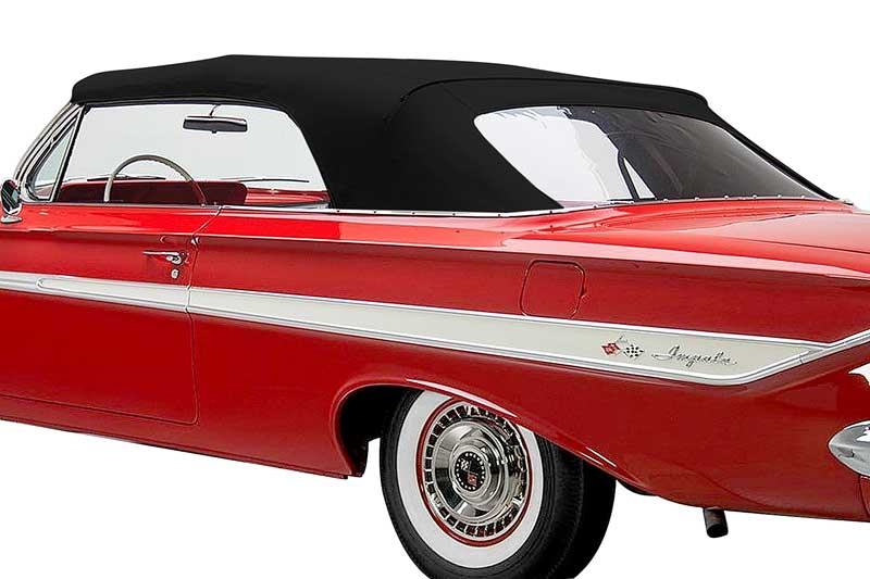 Reproduction convertible top, manufactured using heavy weight sateen backed Superior Pinpoint vinyl materials and original manufacturing techniques to assure you receive the best quality replacement top on the market! Seams are highly improved upon by utilizing dacron thread and heat sealed lap seams to offer an original appearance while exceeding OEM specifications. This is the top portion only that is made for use with a plastic rear window curtain. The rear window portion of the top is not included, but is available separately.