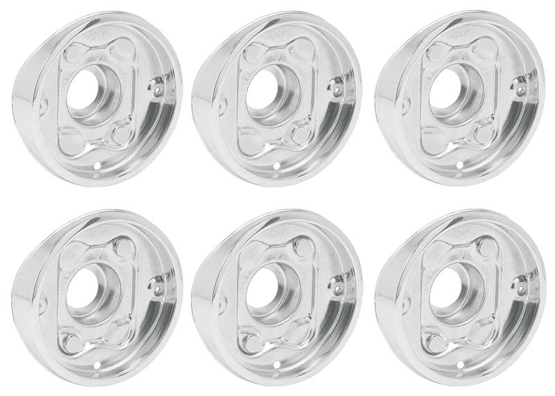 Reproduction rear tail lamp lens or back up lens base set for 1963 Impala models. This superb reproduction set is manufactured to exact specifications and will replace the original exactly. Features a beautiful bright polished chrome finish with correct mounting studs for proper installation. Set of 6 bases included for complete replacement of all 6 of your Impala tail lamp and back up lamp bases. Includes 3 RH and 3 LH bases.