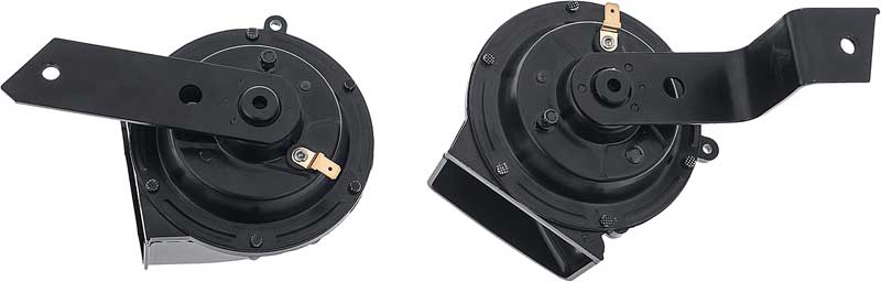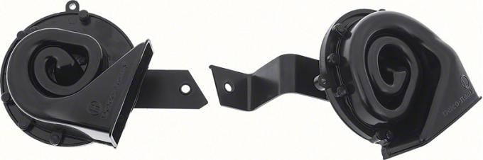 Quality reproduction of the original horn assembly designed for use with 1964 Chevrolet Impala, Bel Air, and Biscayne models. These exact reproductions feature correct semi-gloss black "swirl" shaped housings, with "Delco-Remy" words in the original font. Features the correct mounting brackets specifically designed for use with 1964 models installed on the horns. Each pair includes a high and low note horn. Officially licensed by General Motors.