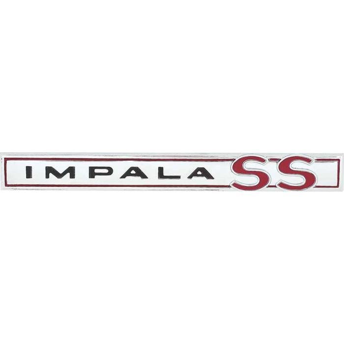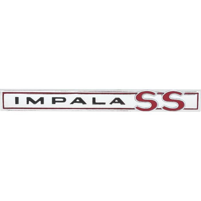 Reproduction Impala SS trunk lid emblem for 1964 Impala SS models. This OEM style emblem is manufactured to exact factory specifications from die-cast zinc metal and features a brushed face finish with red and black lettering as original. Sold individually.