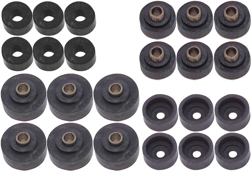 Replacing the original bushings with rubber reproductions is a sure fire way to retain originality and maintain the subframe exactly the way the factory intended. Each bushing in this set is designed and manufactured to replicate the original in every detail, providing the correct fit, appearance, and performance. Every kit includes all shouldered rubber bushings and biscuits required for a complete replacement of the body mount bushings. Each body mount is produced using correct compression molded S.B.R. material with steel sleeve inserts where required. For a correct and authentic restoration, we recommend choosing rubber bushings over polyurethane.