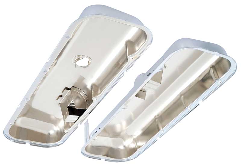 These aftermarket style valve covers are manufactured in a bright chrome finish, with OE style plug wire retainer tabs, correct diameter grommet holes, and oil filler cap hole. These valve covers are baffled inside. Come in chrome plated finish.
