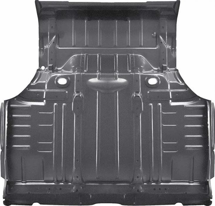 Reproduction of the original trunk floor panel designed for use with 1965 Chevrolet Impala, Bel Air, and Biscayne 2-door, 4-door, hardtop, convertible and sedan models. Each trunk floor pan is manufactured in stamped steel to original factory specifications featuring correct contours for an authentic appearance and fit. Features all the correct reinforcement ribbing, bracing, and drain holes. Will replace the old, rusted or damaged original trunk pan perfectly. Comes with black EDP coating for rust and corrosion prevention.