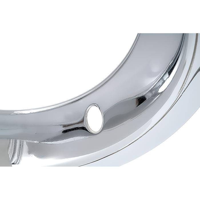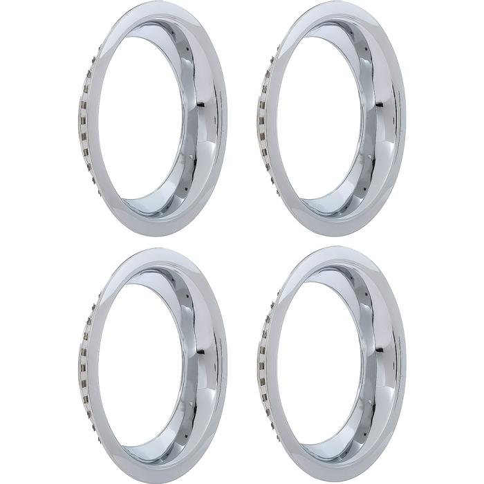 Excellent quality reproduction chrome plated wheel trim ring set. Features a squared edge design and a smooth flat lip. Measures 15" in diameter and 3" in width to fit most of the popular 15" Chevrolet Rally, Pontiac Rally II, and 1969-70 Chevrolet SS-style steel wheels. Sold as a set of 4.