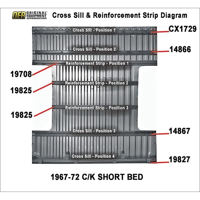 Reproduction of the bed cross sill for 1967-72 Chevrolet and GMC Fleetside trucks with a steel bed floor. This part features a rust preventative coating.
