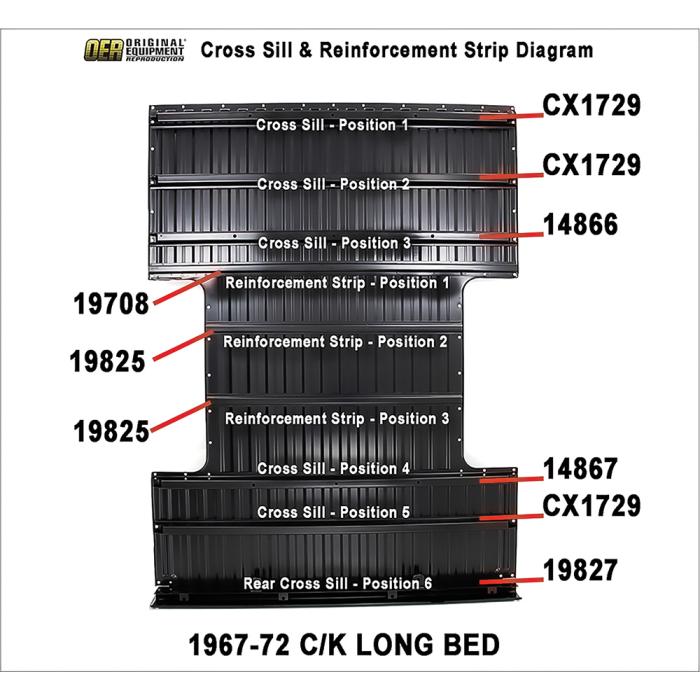 Reproduction of the original bed reinforcement strip designed for use with 1967-72 Chevrolet and GMC Fleetside pickup truck models with steel bed. Each strip is manufactured to original dimensions. Measures 50" long. This part features a rust preventative coating.