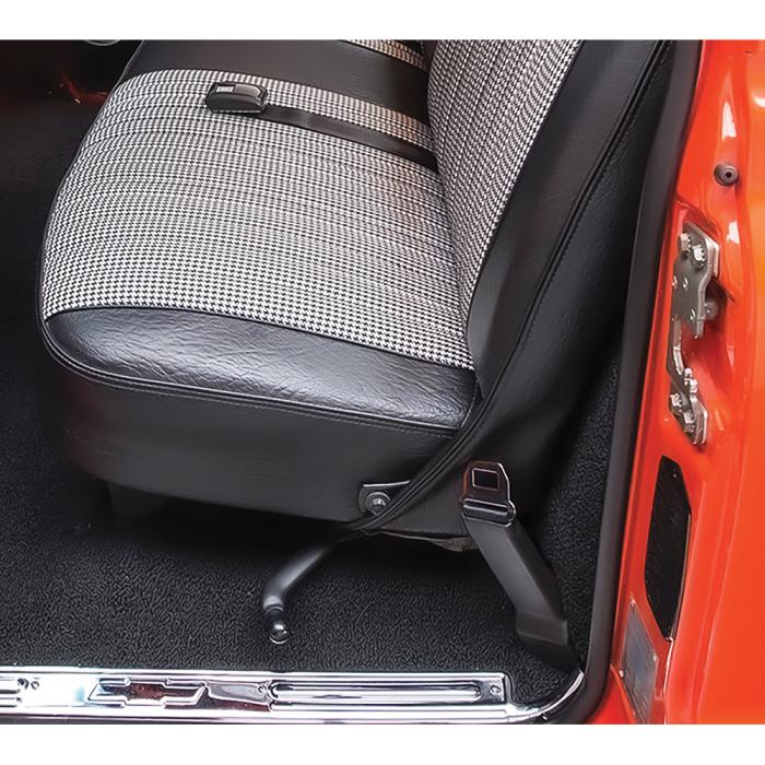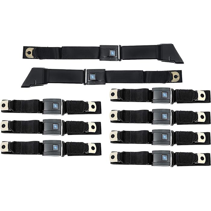 Reproduction seat belt set designed for 1967-72 Chevy and GMC 9-passenger Suburban models originally equipped with a front bench seat. This authentic reproduction of the original seat belt set features a LH and RH retractable seat belt set with high grade, blow-formed ABS housings, and an original-style webbed design belt featuring OE style patterned stitching, in black. Also included in this set is the non-retractable lap belt for the center occupant of the front bench seat, the three passnegers in the second row seat, and the three passengers in the third row seat. Seat belt buttons come with OER's exclusive silver starburst logo on a blue embossed decal designed to be reminiscent of the original button color scheme of the era. These are the most accurate seat belt sets available on the market today. Includes RH and LH front retractable seat belts, non retractable center lap belt, three non-retractable belts for the second row seat, and three non-retractable belts for the third row seat. One set required per vehicle.