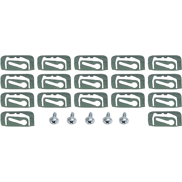 Correct reproduction clips are now available for 1967-68 back glass moldings. When mounting the moldings on your 1967-68 full size Chevrolet, use the correct clips for a proper fit. Each set includes 17 clips, plus 5 screws. Use as required.