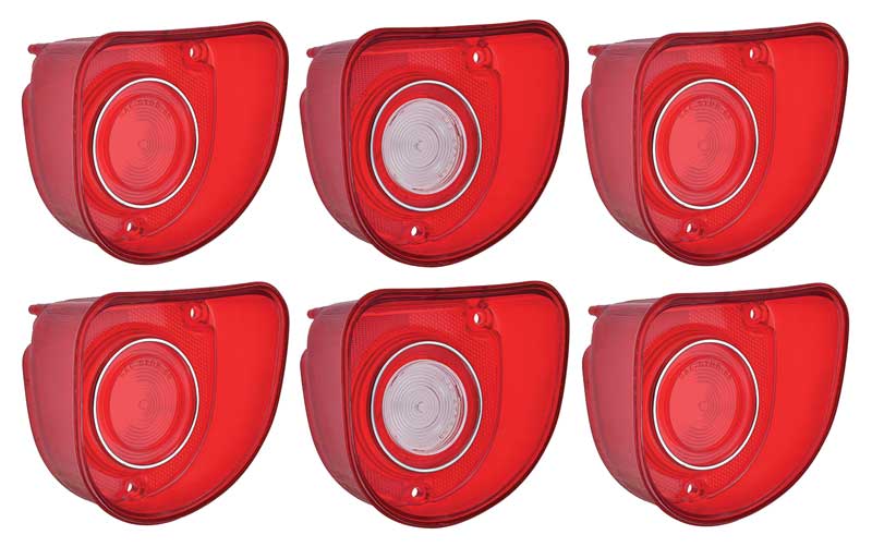 Reproduction rear tail lamp lens and back-up lamp lens set for 1968 Impala models. This 6-piece lens set includes the 4 rear tail lamp lenses and 2 OEM style back-up lenses. Each lens is manufactured to original specifications and designed to replace the originals exactly. Produced with correct color UV stable acrylic materials for an authentic replacement and long lifespan.