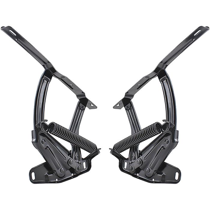 Reproduction hood hinge and spring assemblies for 1969 Chevelle, El Camino, Impala, Bel Air, and Biscayne models. Manufactured in stamped steel to factory specifications, these assemblies restore proper hood alignment and smooth opening and closing operation. Each hinge comes complete with the correct spring pre-installed. Includes both LH and RH assemblies.
