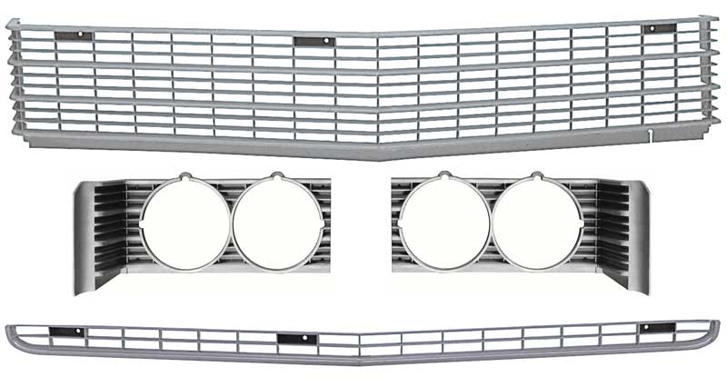 Correct reproduction of the original front grill set designed to replace the upper grill, lower grill and outer headlight bezels with extensions. Each component is injection molded as original and correctly painted silver and black to match the original OEM specifications offering an authentic appearance. Grill components can be painted black for Impala SS models. See part number 3953669 for Bow Tie grill emblem, or CM2850 for "SS" emblem (sold separately).
