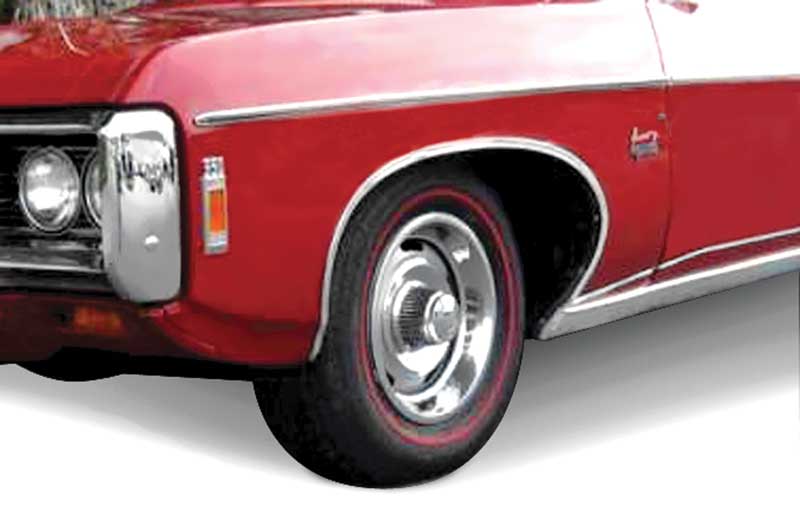 Reproduction of the original wheel opening moldings designed for use on 1969 Impala and Full Size Chevrolet models. Each molding is stamped to original factory specifications with correct contours and finish for an original appearance and fit. Each set includes 2 front fender moldings and 2 rear quarter moldings specifically designed for the 1969 models. A complete set of mounting screws are included with each set.