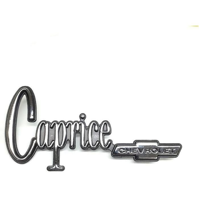Reproduction trunk/decklid emblem for 1973-76 Chevrolet Caprice custom models. This emblem is the"Caprice/CHEVROLET and Bowtie emblem that is chrome script with black trim and background. Sold individually. GM# 9882650.