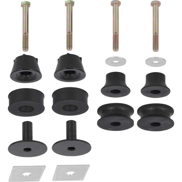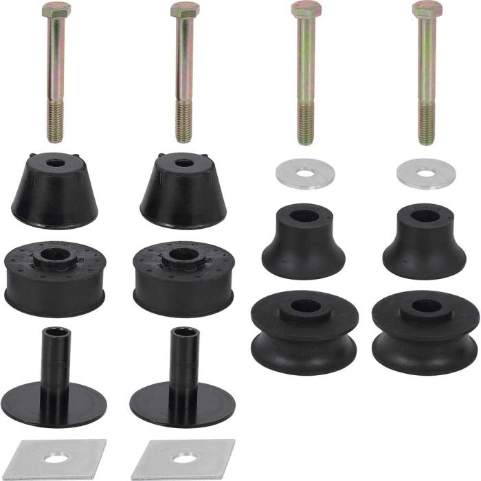 Reproduction of the original front and rear cab mount bushing set for 1973-80 Chevrolet and GMC 1/2 ton 2WD Pickup models. Manufactured to OEM specifications, this set restores proper body-to-frame alignment, stability, and vibration isolation. Each 18-piece kit includes the upper and lower bushings, bolts, spacers, and washers needed for complete installation. Ideal for restorations, maintenance, or replacement of worn cab mounts.