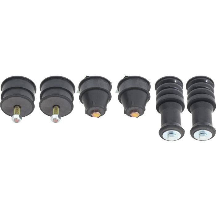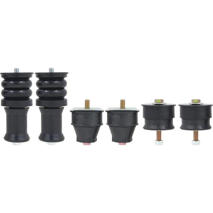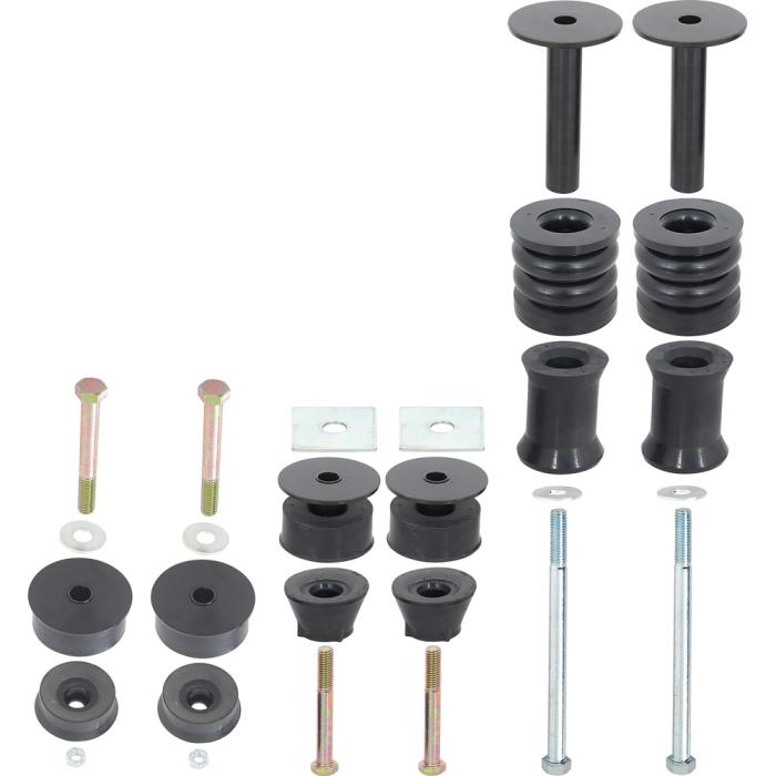 Reproduction body mounting set for 1973-1980 Chevrolet and GMC 1/2 ton or 3/4 ton 4WD standard cab pickup models. Each 28-piece kit includes radiator core support bushings, cab mounting bushings, and associated hardware. Designed to fit K10/K15 1/2 ton 4WD or K20/K25 3/4 ton 4WD standard cab fleetside pickups only. Bed mounting bolt set is sold separately. Two styles are available: T71207 features 6 short bolts and 2 long bolts, while T71207A features 8 short bolts. Both bed mounting kits are 32-piece sets that include nuts and washers.