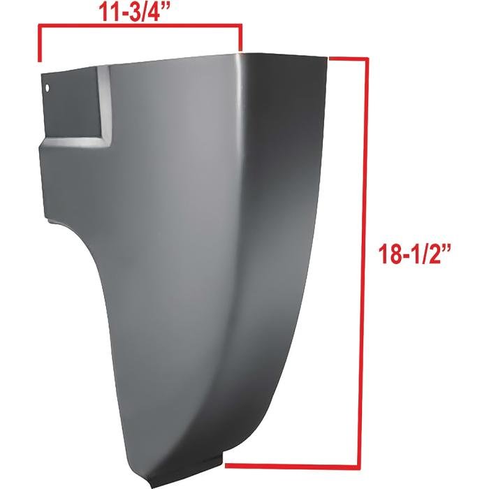 Reproduction outer corner repair panel section for 1973-1986 C/K and 1987-91 R/V Chevrolet and GMC square body pickup truck models. Each repair panel is manufactured in quality stamped steel to the OE configuration, matching the existing corner section. Designed to replace rusted, damaged, or corroded corner areas when replacing the entire panel is not necessary. Measures approximately 11-3/4" wide by 18-1/2" tall. Constructed from 19-gauge sheet metal and finished in black EDP coating for rust and corrosion resistance.