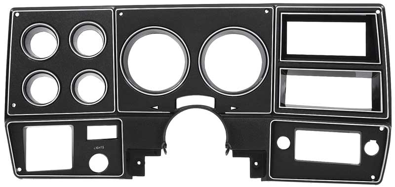 Reproduction dash instrument bezel for 1978-80 Chevrolet and GMC pickup, Blazer, Jimmy, and Suburban models with air conditioning. Each bezel is manufactured to correct factory specifications featuring correct openings for gauges, radio, and instrumentation. This bezel is manufactured in quality automotive grade ABS to factory specifications offering an authentic appearance and fit.