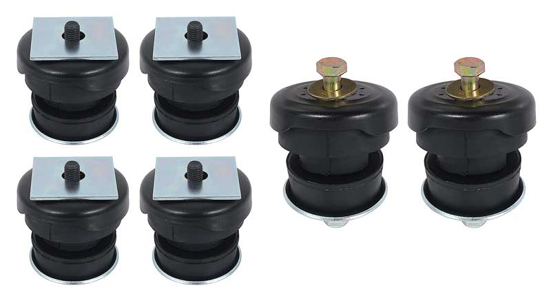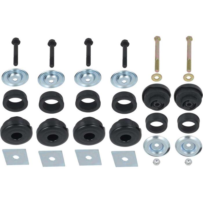 Reproduction body mounting set for 1981-1983 Chevrolet and GMC standard cab fleetside pickup models. Each 32-piece kit includes radiator core support bushings, cab mounting bushings, and associated hardware. Designed specifically for standard cab fleetside models only. Bed mounting bolt set is sold separately. Two styles are available: T71207 features 6 short bolts and 2 long bolts, while T71207A features 8 short bolts. Both bed mounting kits are 32-piece sets including nuts and washers.