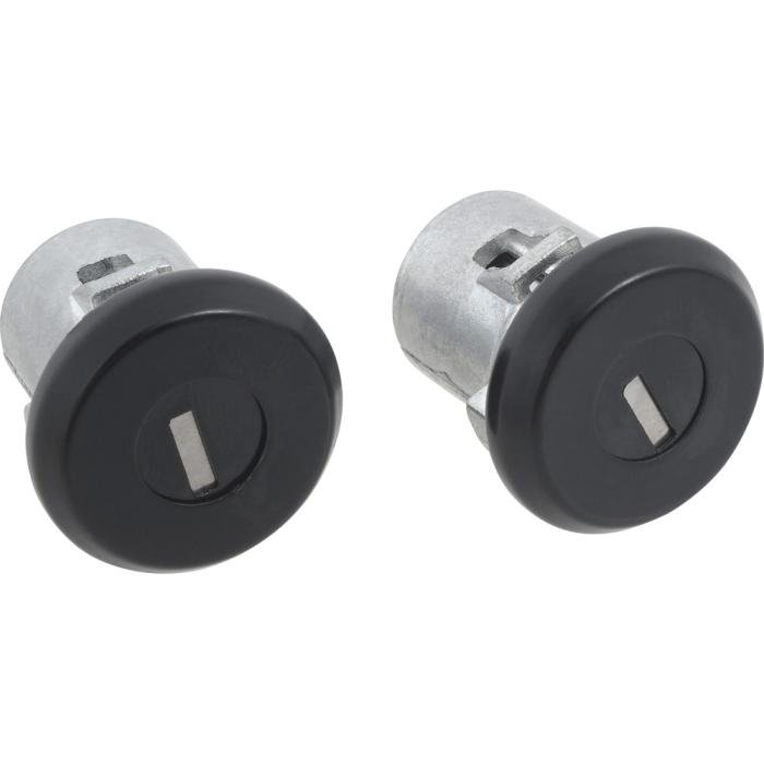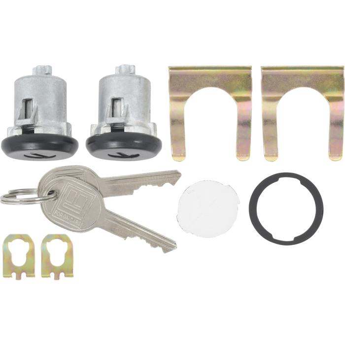 Reproduction door lock cylinders for various 1961-87 Buick, Cadillac, Chevrolet, Pontiac, and Oldsmobile models as listed. Includes two door lock cylinders with black face finish, two generic logo keys, cylinder retainers, and gaskets for a complete replacement. NOTE: Check lock pawl shaft length on your original door lock before ordering, this lock features the short style shaft.